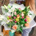 Сиреневый букет роз, хризантем и брассики