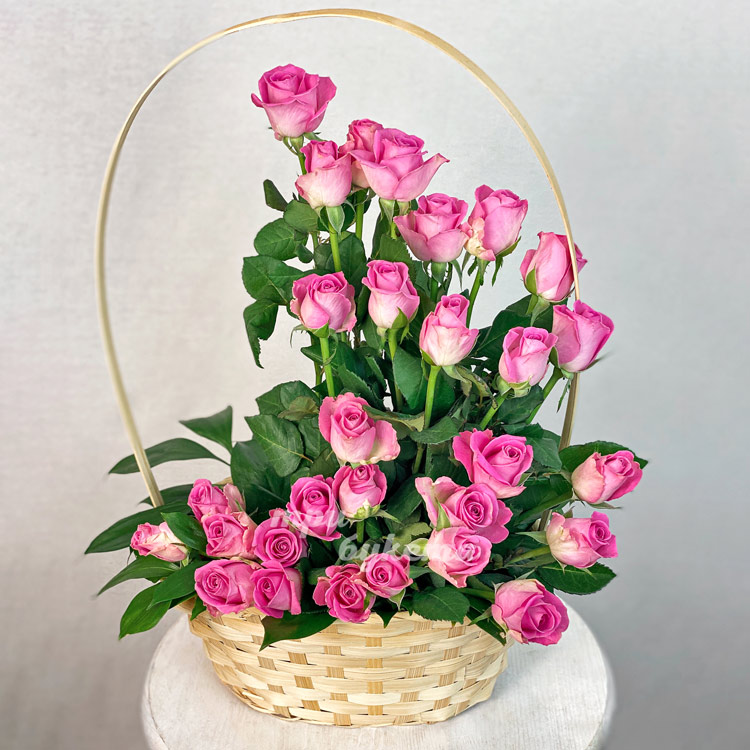 30 розовых роз в корзине