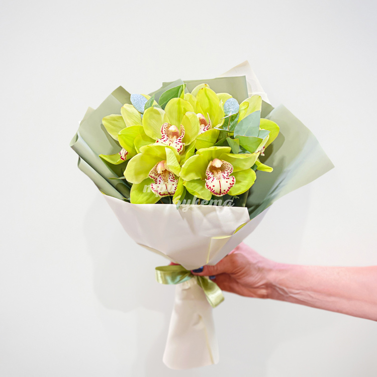Букет зеленых орхидей с эвкалиптом