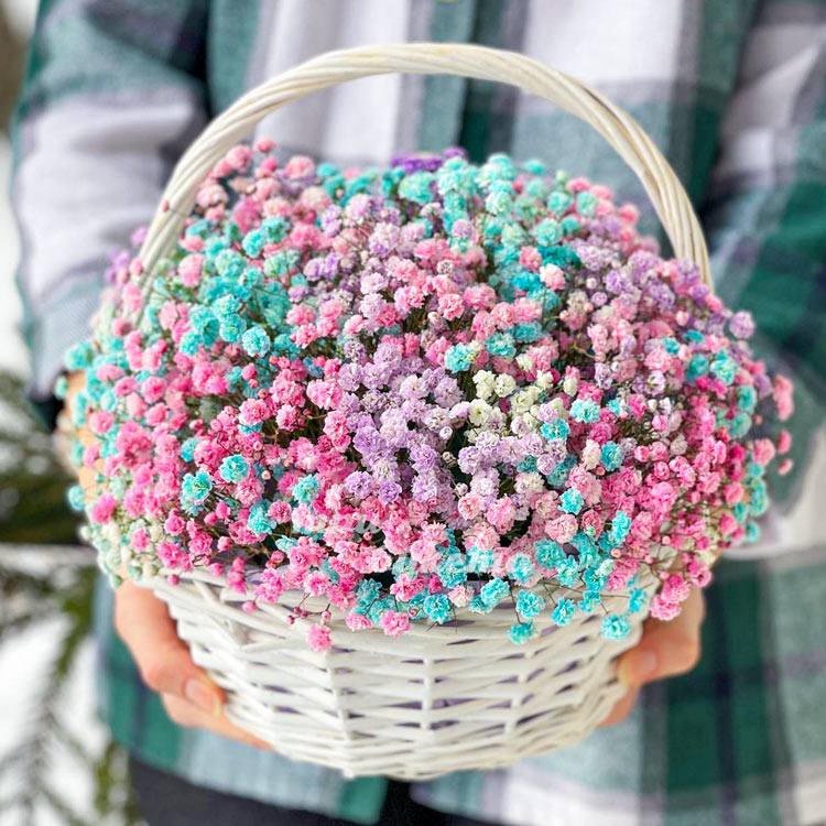 Голубые и розовые гипсофилы в корзине