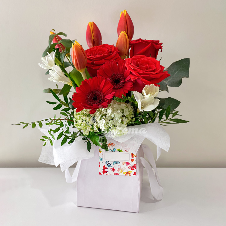 Коробка красных гербер, роз и фрезий