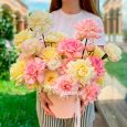 Коробка розовых французских роз и хризантем