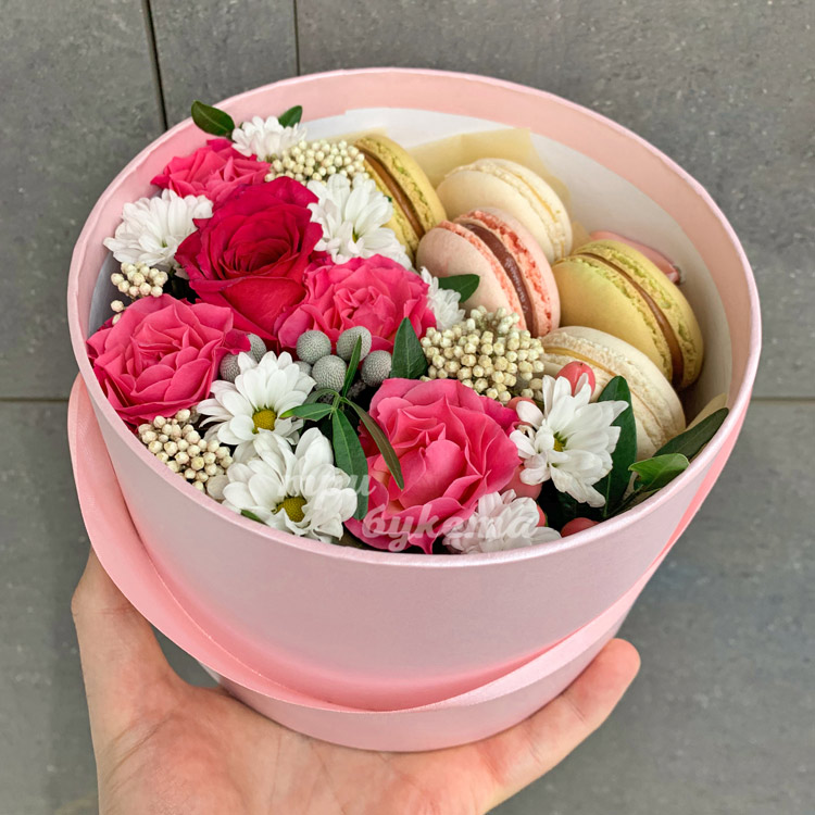 Коробка с 5 макарунами и хризантемами