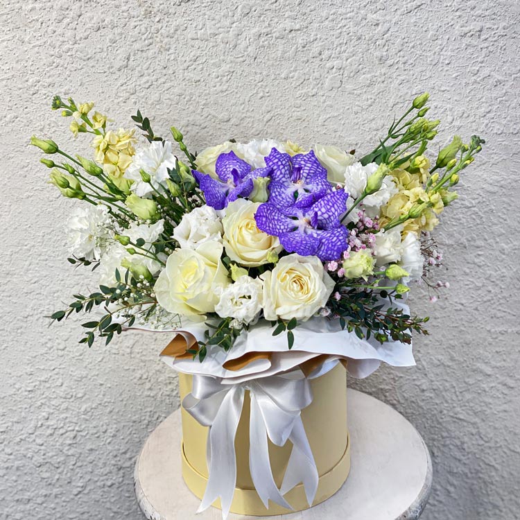 Розы и орхидеи в шляпной коробке
